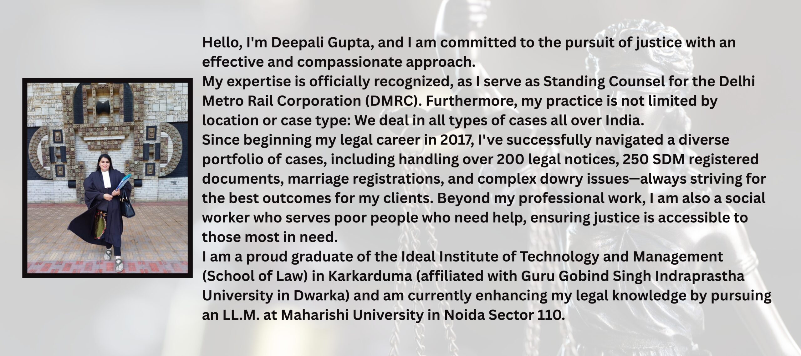 We sought the assistance of Advocate Deepali Gupta for the registration of our marriage, and she facilitated the entire process in an exceptionally simple and stress-free manner. She provided guidance on all the necessary requirements, prepared all the essential documentation, and ensured that everything was finalized without any complications. I highly recommend her for any family legal issues.